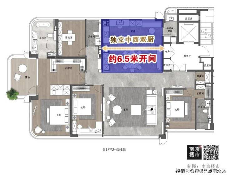 看户型,应该每个人都对这个大厨房印象深刻,约6.5米的开间,这是什么概念?