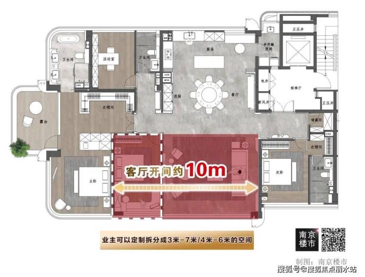 更重要的是,10米的开间,业主可以定制拆分成3米-7米,或者4米-6米的空间,自由度很高!