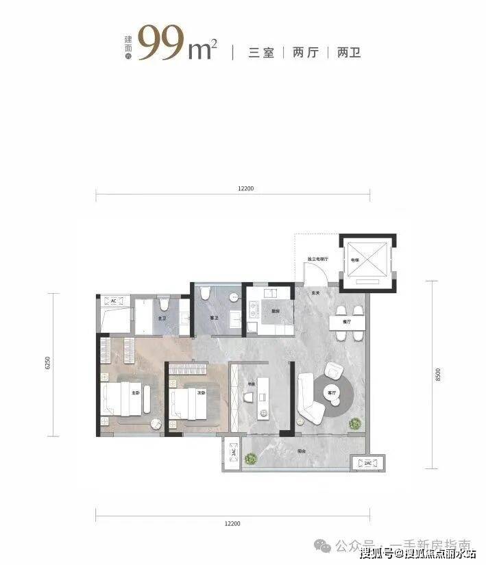 建面约99平户型,打破常规,空间布局设计优化到了极致,赋予其独立电梯厅、通透三房、双卫设计的高配置。