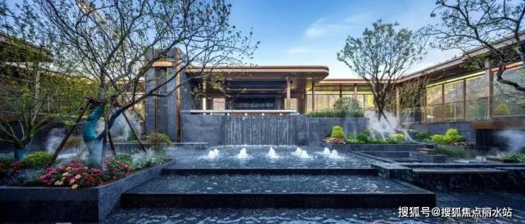 在园林内部抬高约2米,结合花园绿植、叠级水台、休闲卡座,打造出下沉式立体山水景观。