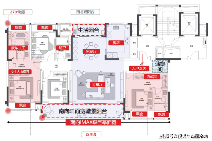 项目所有户型全部囊括一系列豪宅元素:私享电梯厅、超大面宽、四开间朝南、大横厅、双联阳台、南向双套房,三卫生间……