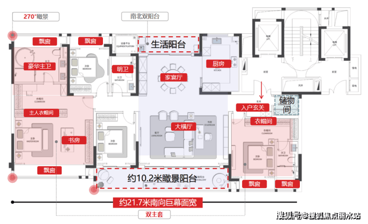 采用罕见约21.7米南向大尺度横厅+3.15米层高,搭配超大观景阳台,大宅气场全开。