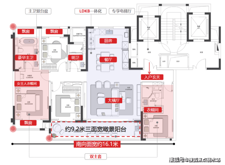 这款户型的南向面宽,足足有约16.1米,采光面最大化,几乎碾压市面上同等户型。
