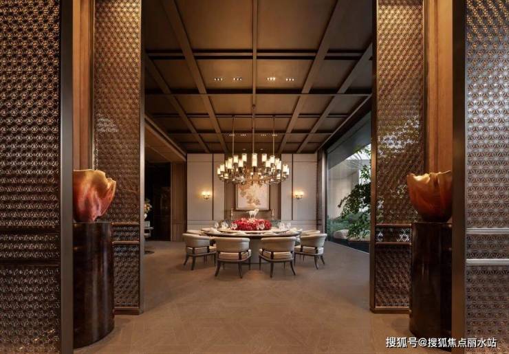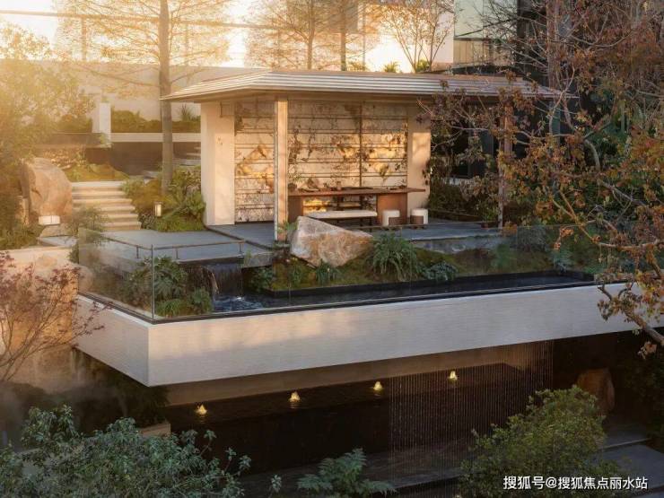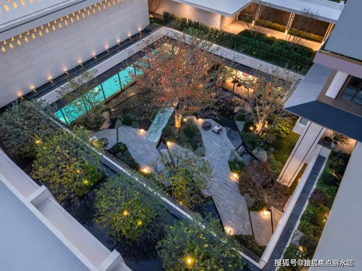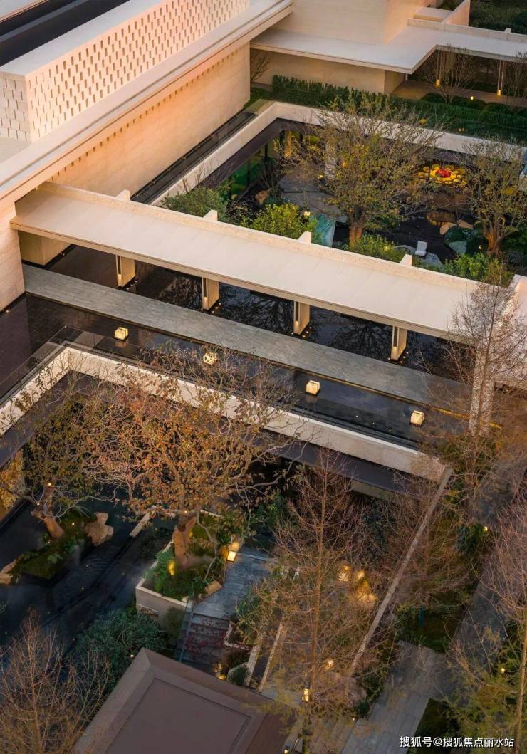 注意到地面的水景了吗?这也是点睛之笔,一直延伸到庭院上方,形成一种视觉上的无界相连。暖色灯光点缀在水景中,氛围感拉满。