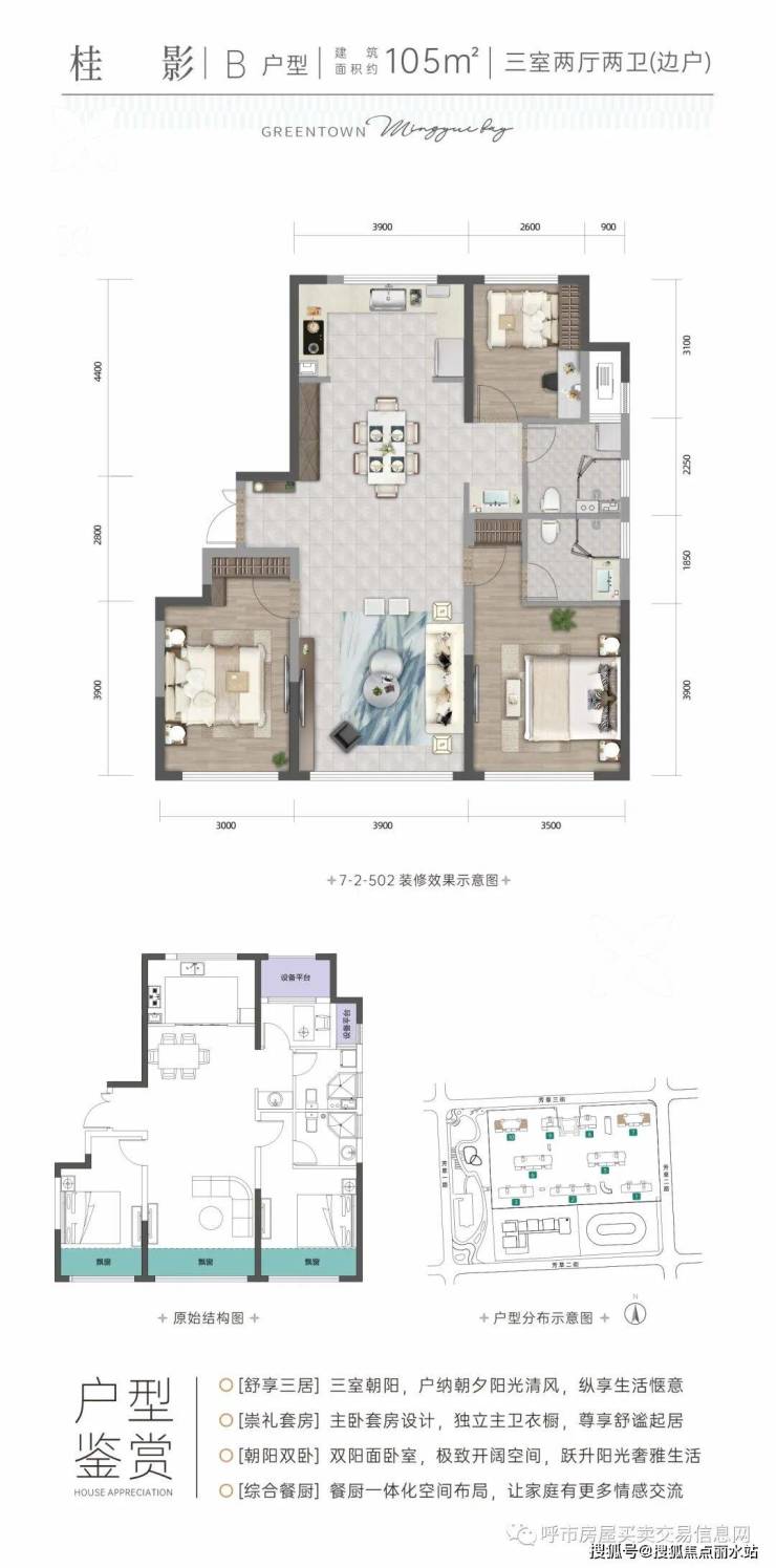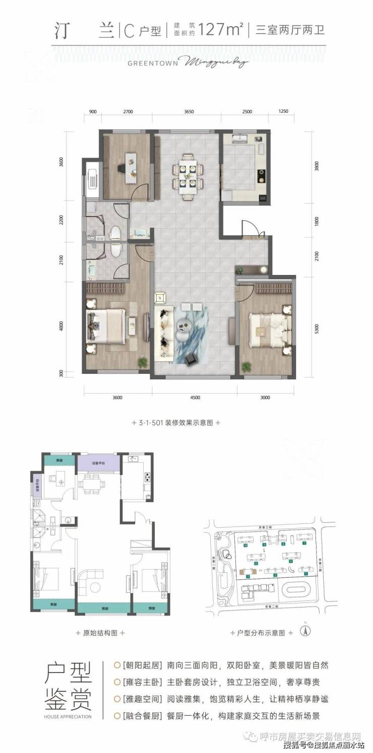 以两廊、三带为核心纵横分布,三大景观带由东向西分别为乌素图沟、霍寨沟及白石头沟;打造5到15分钟三级公园交互空间,出门即入园;项目直面万亩横贯伊利健康谷的田园生态走廊,生态与生活紧密相融。