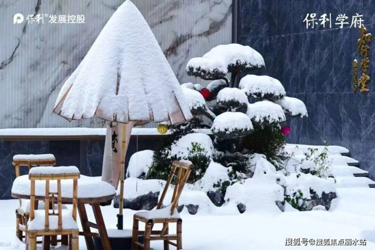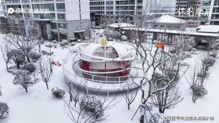 保利学府冬日限定皮肤加载完毕,树上的红花裹满了白雪,园区的松树和雕塑积了雪,美得像是电影场景。