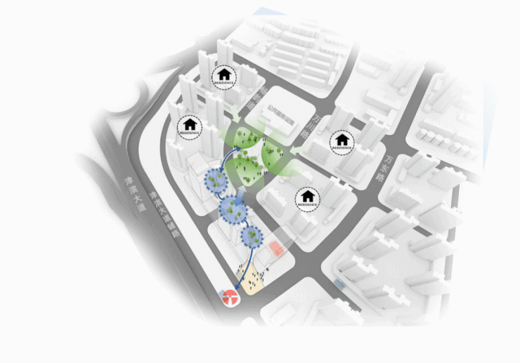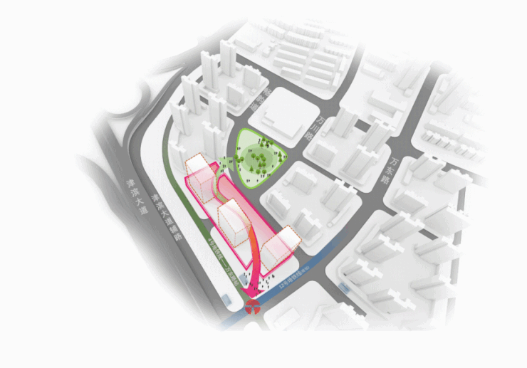 “ 我们不得不尝试做出改变。这是一个特别的地块,它位于天津双城双轴的重要节点,且面临南侧25万方商业竞品的竞争压力,我们希望结合双地铁与公交首末站,构建无缝连接城市周边的接驳中心,同时引入中心公园优渥的景观资源,延续城市绿道,打造室内景观室外化的特色商业空间 ”