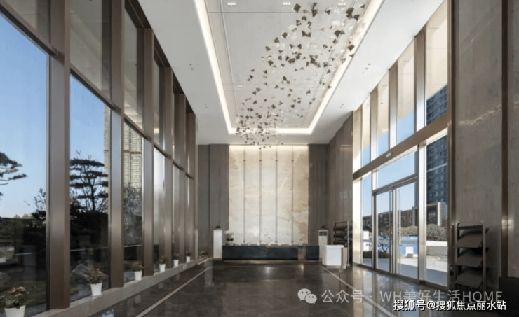 归家大堂挑高约8.8米,以普拉达绿奢石与古铜色拉丝不锈钢打造,质感堪比星级酒店