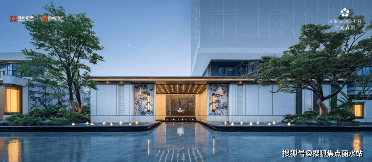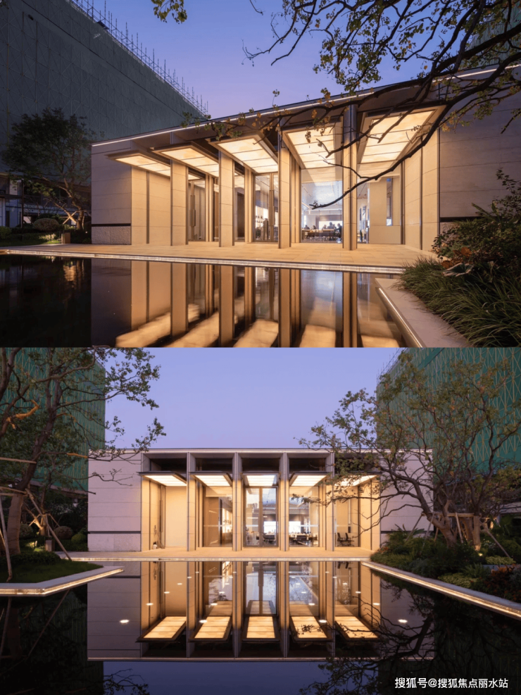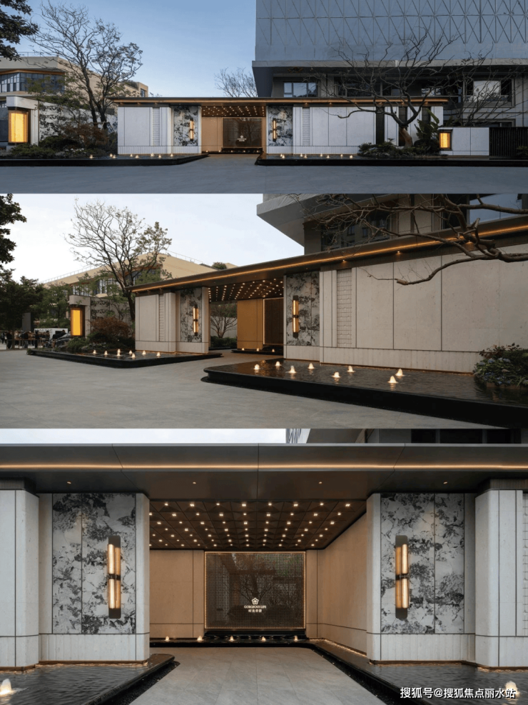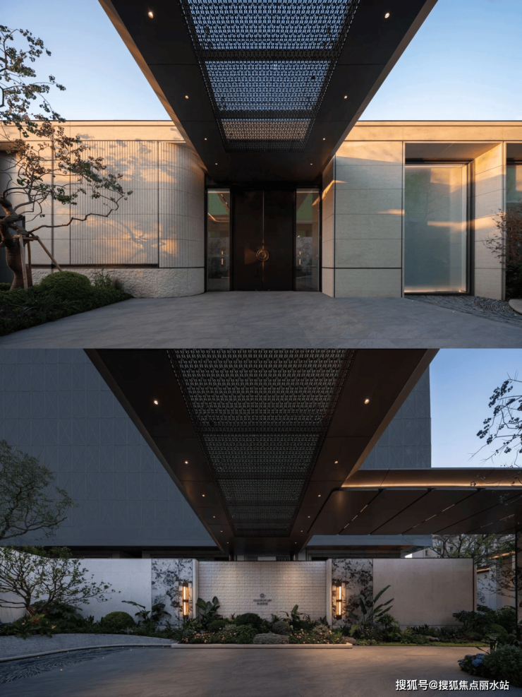 建筑立面选用米白与暖灰的现代轻奢色系,铝板线条+涂料一体板组合使用,简约线条设计,彰显现代典雅美学风格。