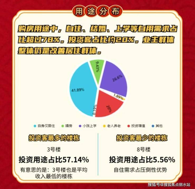 从小区业主自己统计的购房用途看,自住,结婚,上学的需求超过78%,投资占比约20%。