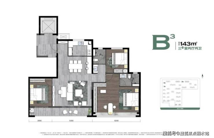 其中三室有端厅,270°采光,是当时三代住宅里,300万总价里少见的户型。