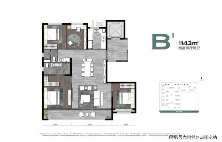 另一个叫主卧小家,类四叶草布局,但南向面宽超过14米,主卧南向面宽6.2米,也能改造成两个卧室。