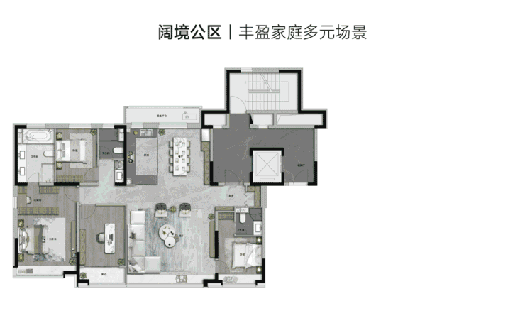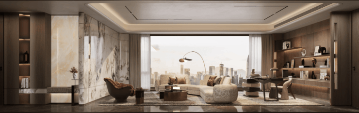作为三居使用时,可将客厅打通,尽享约7.4米宽尺横厅,巨幅观景视野,当家庭结构或需求发生变化,客厅一侧的灵动空间可被打造为书房、儿童房或者健身房等,即刻演变为四居,满足家庭功能使用需求的基础上,尽可能延展使用周期,减少置换成本。