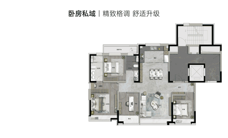 经典三叶草布局,三个卧室以起居空间为中心,各自独立,互不打扰,同时又能保持很好的统一。主卧约22㎡套房设计,270°转角落地窗+双台盆卫浴空间+衣帽间的高规格配置,更健康私密独立,集收纳、观景、休憩等功能于一体,营造更奢适朗阔的居住环境。次卧紧挨客卫,形成准套房设计,就近满足洗漱需求,提升居住便利性,让每处空间尽展舒适。