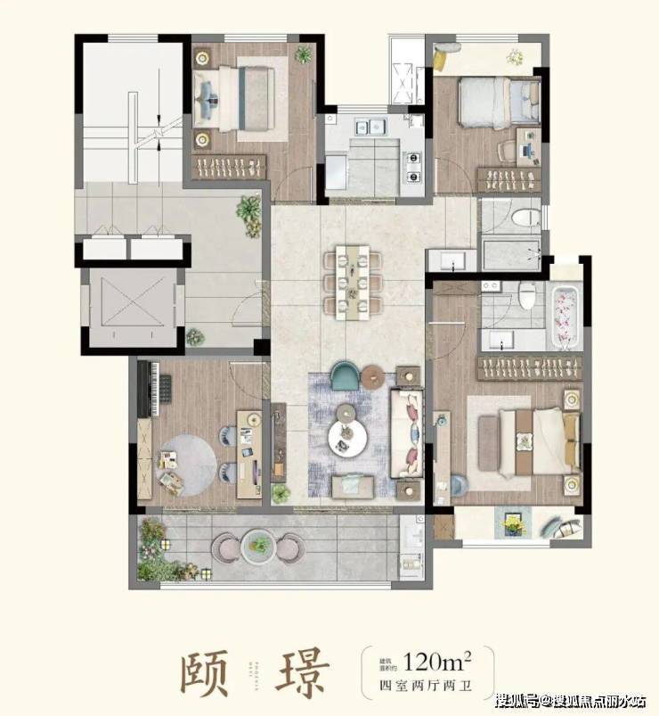 建面约120㎡洋房,纯正四叶草户型,三开间朝南,空间0浪费,利用率极高,一家人的起居生活互不打扰。