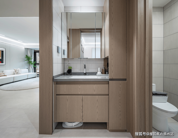 卫浴空间则配备了升级版的增压大花洒与温度可视系统,并且配置可推拉的置物架,让洗浴用品触手可及,同时又能保持卫浴空间的整洁美观。
