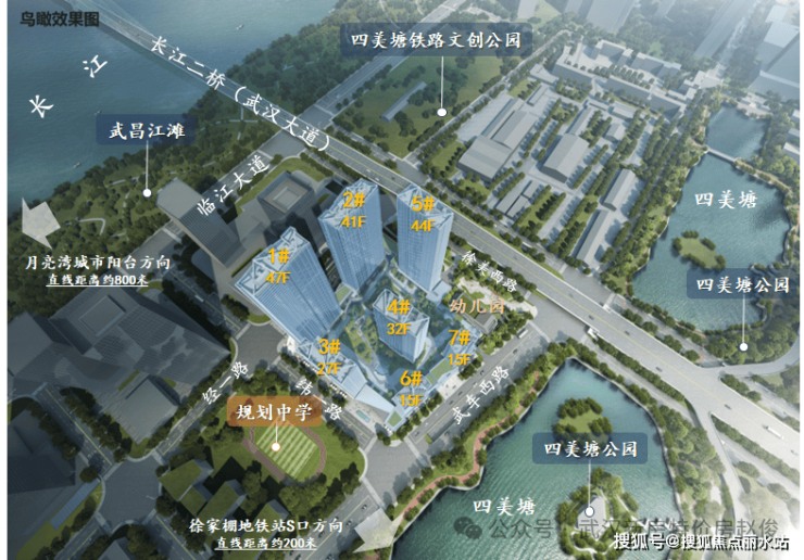 ➢【景观配套】「一江一湖五园,武昌滨江生态绿核」项目位于长江畔,背靠四美塘,有月亮湾城市阳台、四美塘公园、四美塘铁路文创公园、武昌江滩公园、新中央公园(规划)等五园环绕,人文生态体系景色宜人,天然城市氧吧,生态宜居。