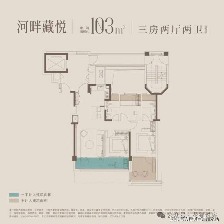 建面约103㎡户型:三开间朝南,超大南向双阳台(连通客厅与次卧)+空中露台(连通主卧套房)+北面三飘窗+冰箱外移至S墙,释放厨房空间,实现中西双厨, 赠送面积超多,得房率超100%!
