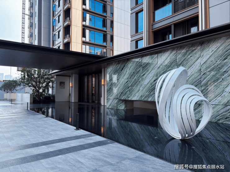 我站在大门口,看到小区楼幢全部封顶,外立面“完全呈现”,看着四面大面积铝板+玻璃的实景质感,很美很有辨识度。