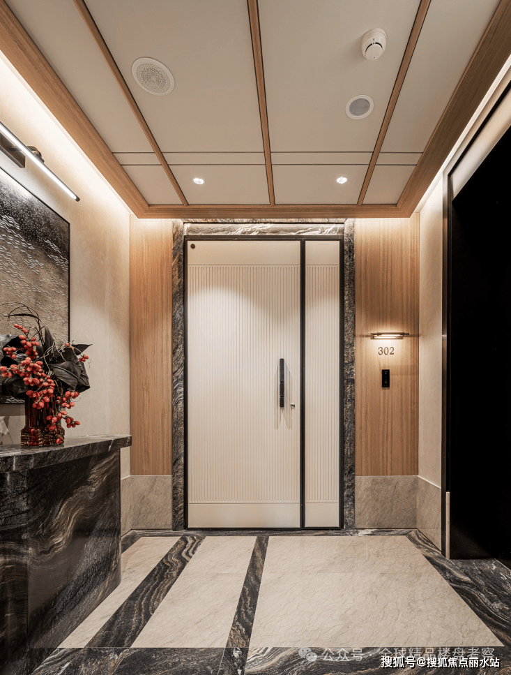客厅的吊顶一整圈选用稀有的紫山水石材,施工难度极大,每一块的纹理都是独一无二的艺术品。玄关处精心设计的收纳系统可轻松容纳百双鞋子,解决了高端客群的实际痛点。