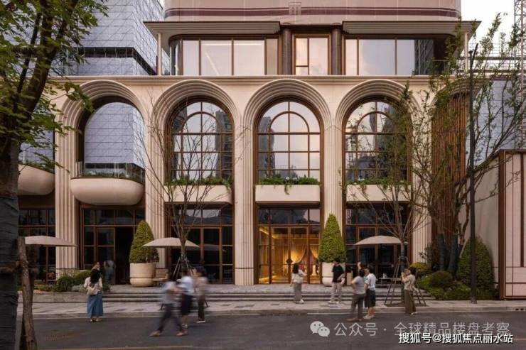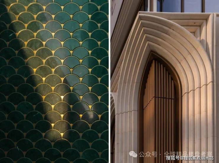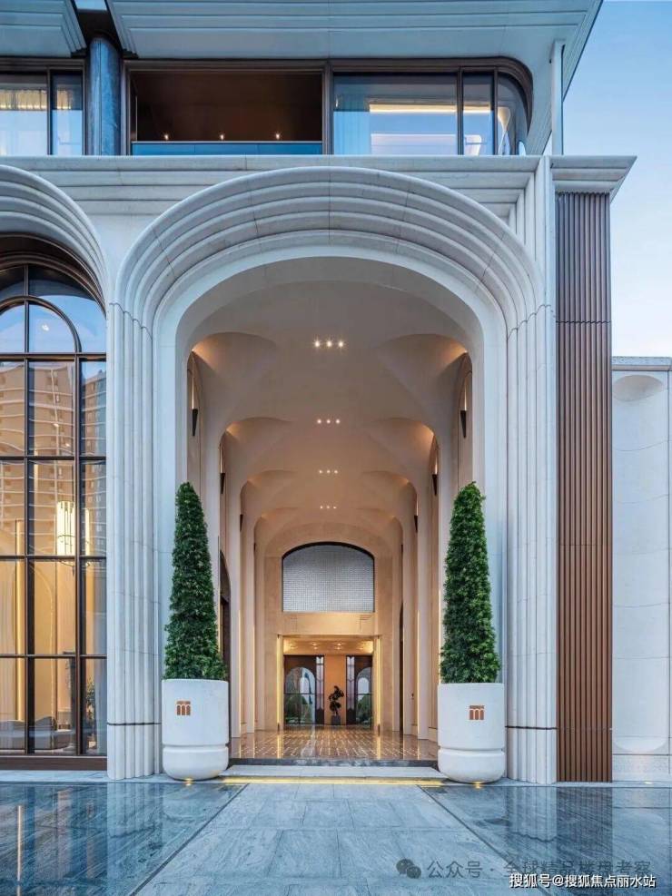 项目采用12米高拱券大门、宝格丽绿石材与古铜金属线条交织,形成迎宾序列;意大利贝金米黄石材弧形景墙与铜马雕塑传递“龙马精神”寓意。近十二米通高的拱券,通体以石材打造,层层叠涩,气势恢宏。