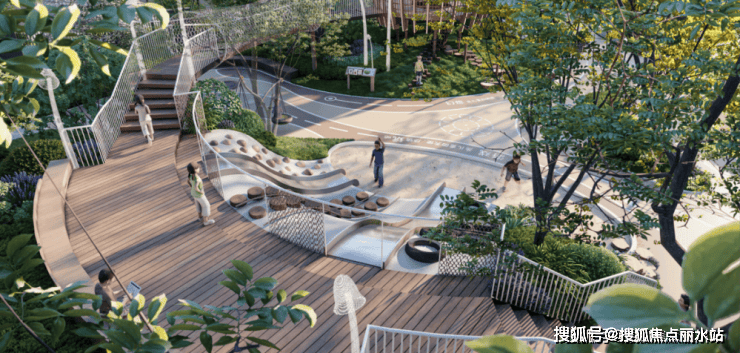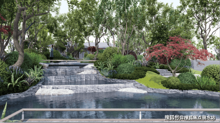 经过社区大堂就是约3600平方米超大尺度中心景观区,采用中式造园手法,强化高差体验,通过叠水、塑山、挑台、飞虹、跌瀑等实现景致的层次错落,塑造多维空间,在繁华中重拾朴素自然之美。