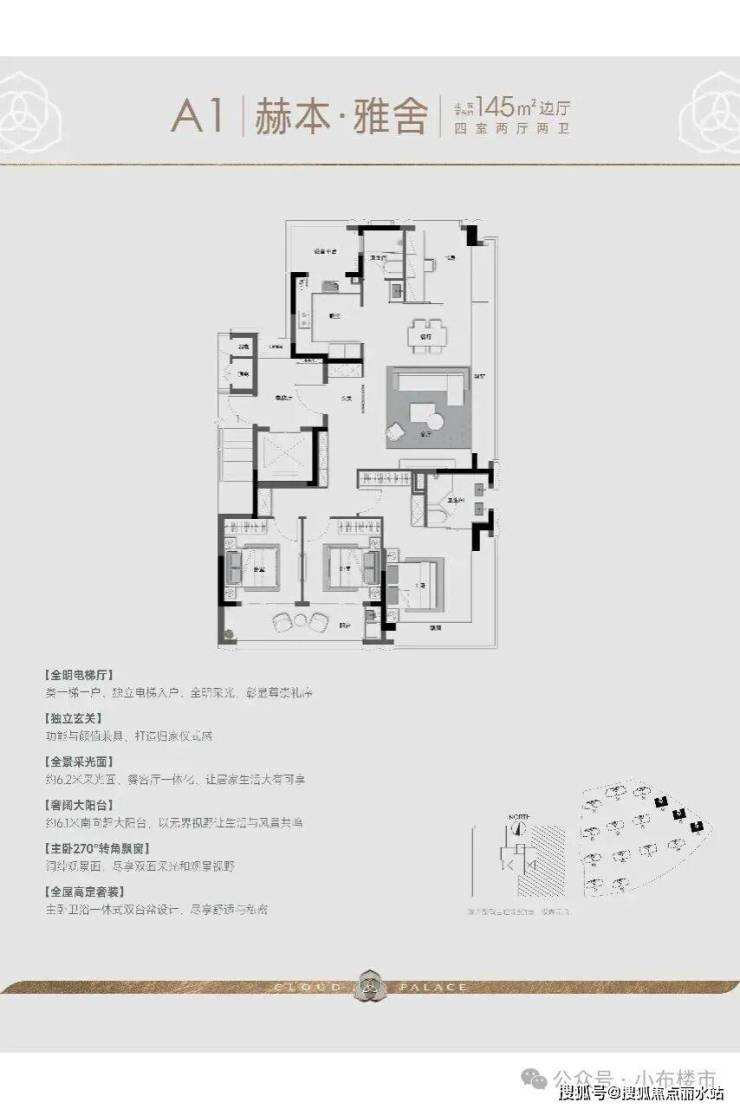 建面约145㎡户型采用类一梯一户全明电梯厅设计、超长一体飘窗、全屋奢阔采光视野、奢阔双联阳台,为主人量身定制。