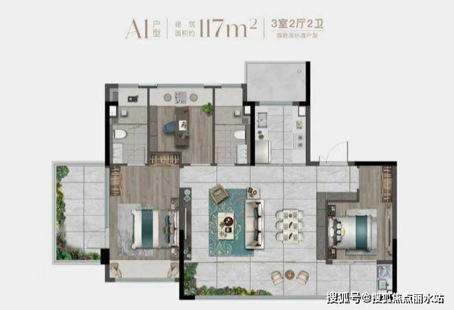 A1户型,露台连接主卧,客厅到卧室形成三联阳台。