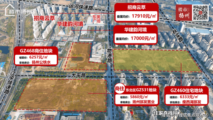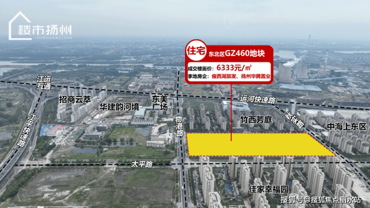 2023年8月2日,东北区GZ460住宅地块(竹西芳庭西侧地块)经过1轮报价,被瘦西湖旅发、扬州华腾置业拿下,成交总价57600万元,成交楼面价6333元/㎡。