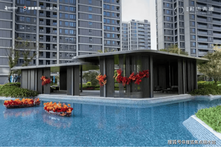 园内,阔绰的戏水池尤为抢眼,大面宽浅水区与临水亭的搭配,既满足了景观的观赏性,又兼顾了社区公共空间的互动属性,而水面点缀花艺饰船的细节,也在不经意间透露出桂语青澜对于园林美观度的极高标准。