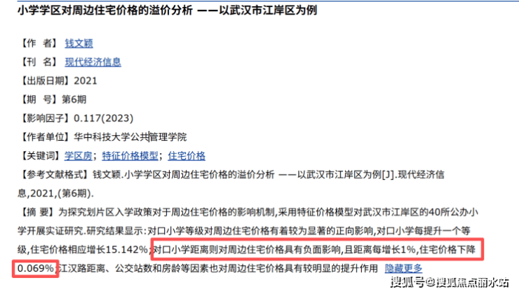 这种现象并非只出现于温州,据华中科技大学的参考文献显示,在武汉某优质小学施教区内,房源与小学的距离每增加1%,房价平均下降0.069%,类似的案例在北京、海口、扬州、台北等地均有出现,足以证明“近校房”的价值所在。