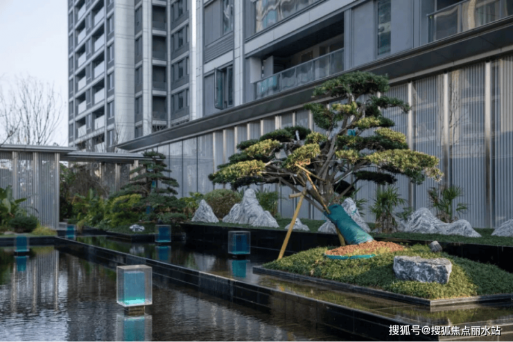 从社区前庭开始,桂语青澜以黑色奢石为基底,串联起置石、造型植物与多层镜面薄水,后方浅灰+银白色的格栅式立面,衬托出主景两株罗汉松的素雅大气。