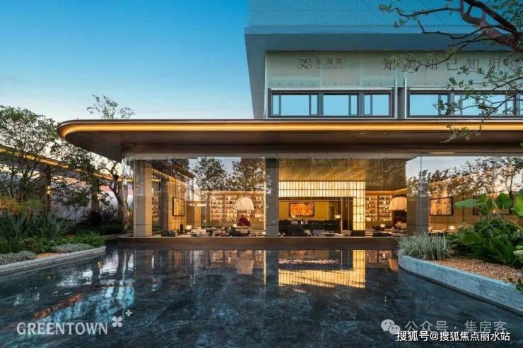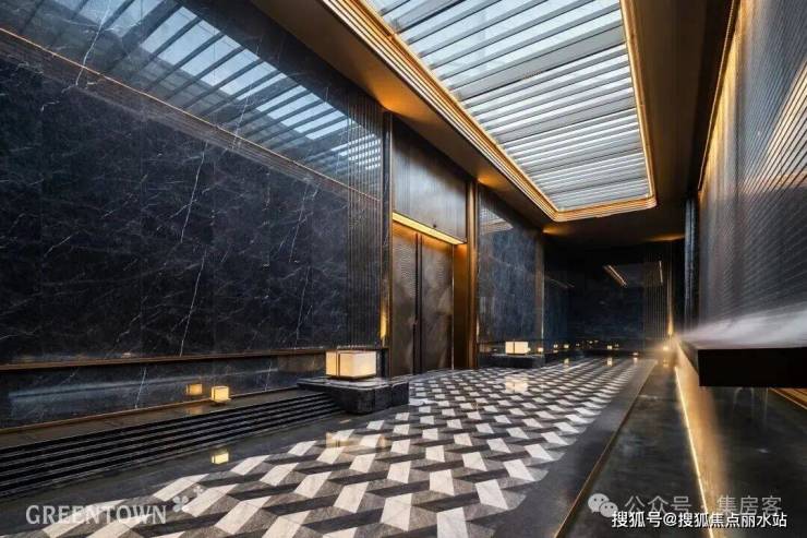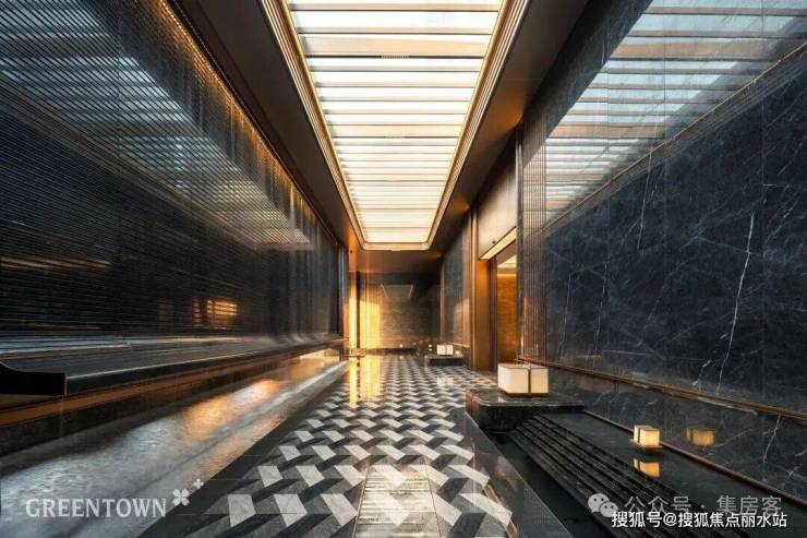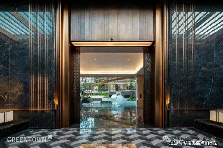 主入口知·云栖,取意西湖十景以"洄游"为理念,超52米跨度的回字形布局,重构传统"四水归堂"空间序列,约2.4米“流光礼宾” 塔冠,如悬浮的美学灯塔,与金色挑檐相映成辉,全封闭式阳台勾勒建筑轮廓,让立面如镜幕般收纳约30公里江岸鎏光!