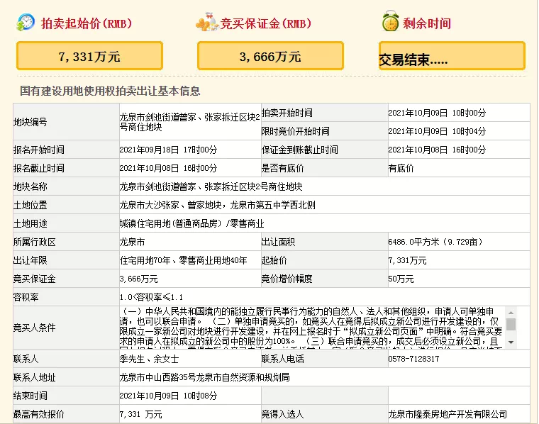 刚刚,龙泉市剑池街道曾家、张家拆迁区块2号商住地块成功出让。龙泉市隆泰房地产开发有限公司以7331万元竞得,出让面积为6486平方,竞价溢价率0%,底价成交,楼面价为10275.28元/㎡,这也是2021年龙泉下半年第三宗住宅用地成交。