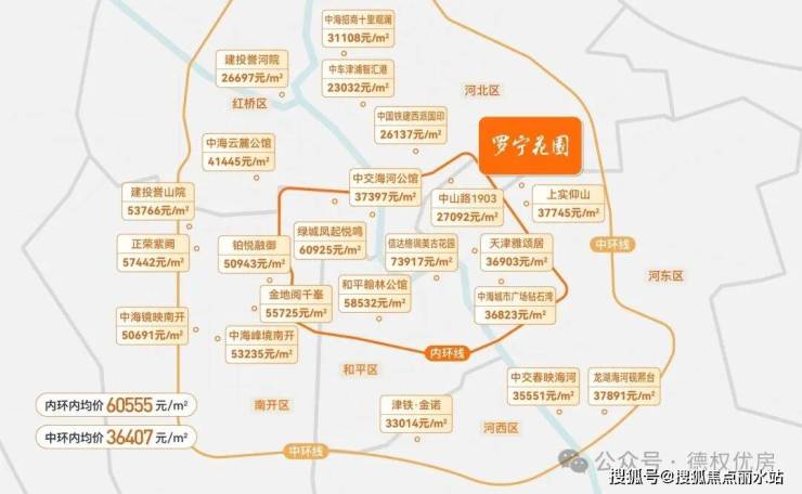 天津站、津湾广场、海河等重要地标林立,金街商圈滨江道、劝业场、恒隆……老字号与现代商业交织,中环以不⾜全市约1%的⼟地⾯积,坐拥约25%的⼈⼝、约40%的三甲医院和约70%的⼤型商圈;划界房价分水岭。