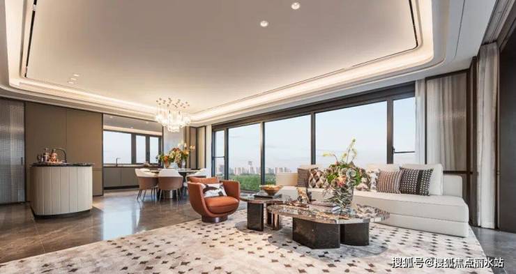 这是顶豪惯用的 端厅户型,站在餐客厅,三面采光、三面视野,好不畅快!在落地窗的包裹下,空间格外通透敞亮,有种一切尽在掌握中的从容。