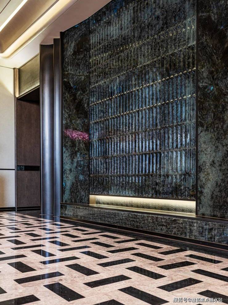 入户大堂的地面高成本地采用卡塔尔灰石材,且用两种石材拼花铺设,深浅灰色交织,秩序却不呆板,精致却不刻意。