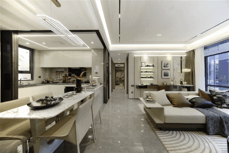 铂萃云湾在建面约110㎡户型中采用LDK一体化设计,将客厅、餐厅、厨房融合成开阔通透公共空间,突破传统厨房与外界的空间屏障,让空间视野一览无余。