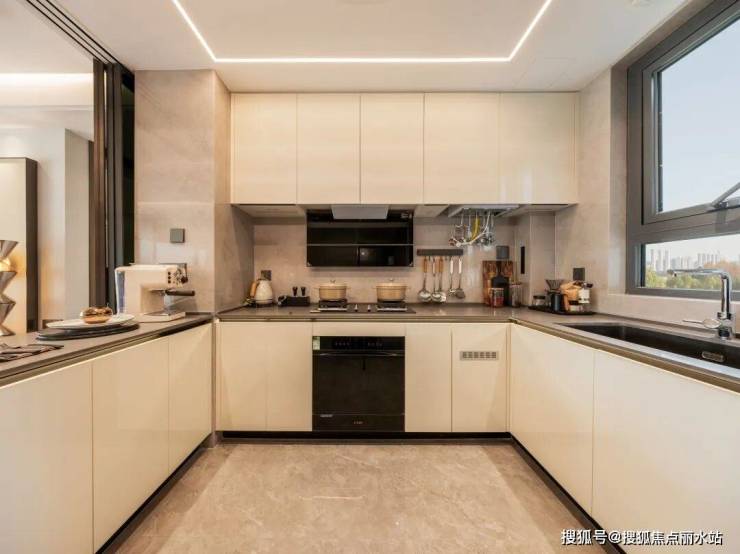 厨房配备了瑞士弗兰卡的水槽龙头,水槽采用瑞士弗兰卡黑色花岗岩,中西厨岛台大面积采用岩板。