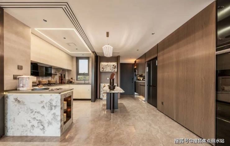 这种创新设计,一方面,可以增加公区的储物柜。有了内凹的一段墙体,如冰箱、柜子等大件家具就能嵌入墙中,视觉上也更美观。另一方面,可以释放更多功能区的实用性。如冰箱等大件家具得到安放后,对于厨房无形中也是一种空间的放大。