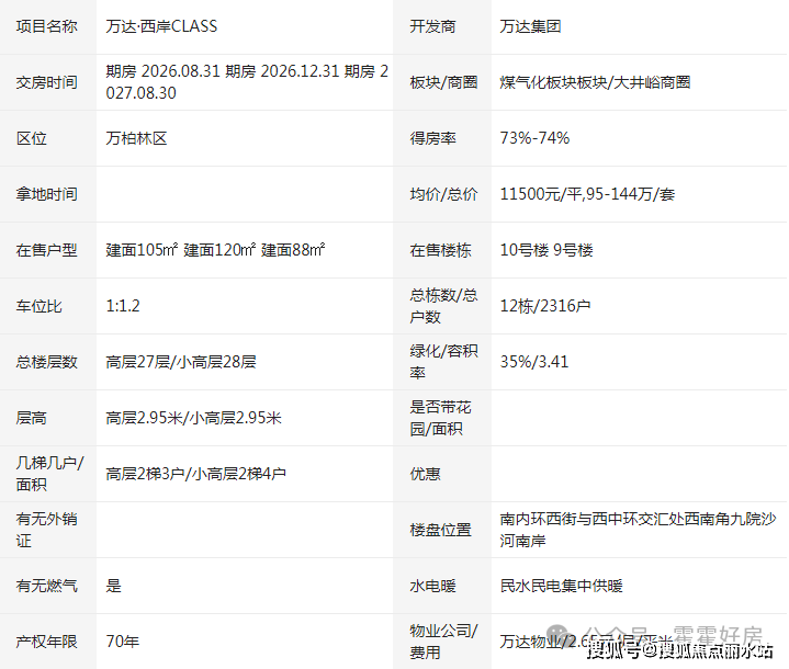 2020年9月,万柏林区教育局与山西省实验小学教育集团成功签订教育发展战略合作协议,在煤气化片区打造山西省实验小学万柏林第一校区与山西省实验小学万柏林第二校区(新道街小学),切实满足人民群众对优质教育的新期待。两所小学按照土地出让条件,由中铁诺德逸尘云著项目以及华润·华侨城公园九里项目无偿代建,建成后移交万柏林区教育局。两所小学是属于区教育局统一管理的公立公办小学,目的是保障煤气化片区居民义务教育阶段需求。万达·西岸CLASS位于南内环西街与西中环交汇处西南角。项目主推85-135㎡户型,支持一次性、按揭付款,开发商担保公积金贷款。