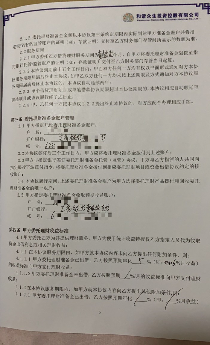 “本来我不想参与这个理财的,可和谐众生公司的工作人员每周每月都会给我发一些材料,劝说我参与。”赵红告诉记者,一年后的2019年11月,她才正式与该公司签订理财合同(具体名称为“投资咨询服务协议”)。
