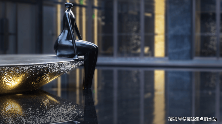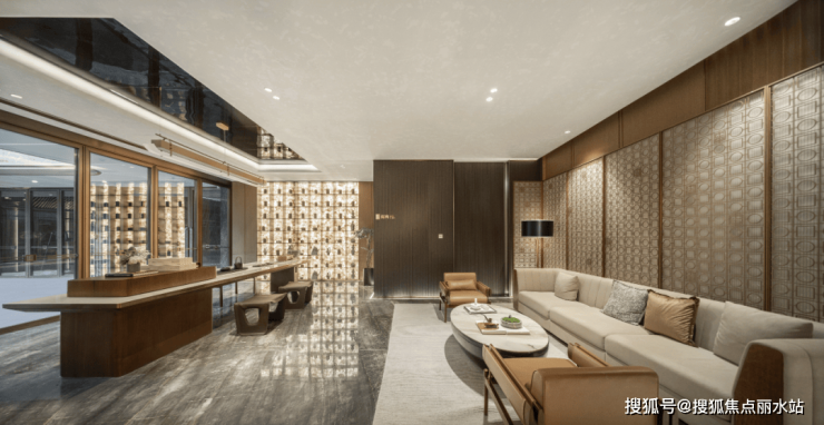 穿过水院,便抵达对标宝格丽酒店的社区大堂,社区大堂以约500㎡面积、约4.8m层高,打破传统大堂压抑感,奠定开阔基调,对称美学、石材与金属的材质碰撞,搭配亚克力与镜面反射,将接待空间转化为兼具尊贵感与艺术感的社交场。