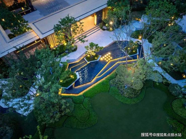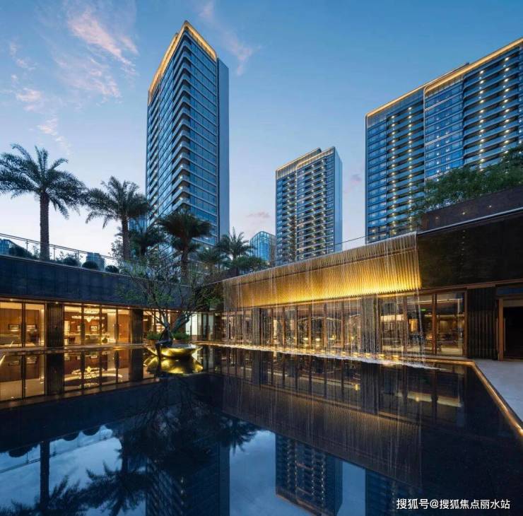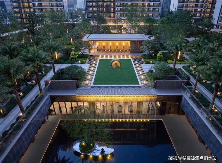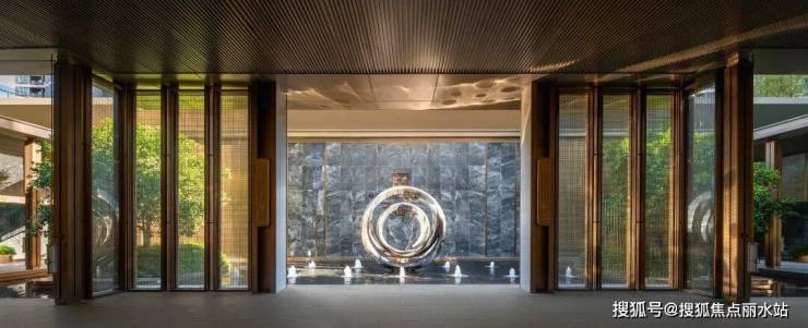 北区入户空间以 “三重院落” 构建礼序,第一进院落便是约60 米宽仪式感门楼前的镜面水院 ,这不是普通景观,而是温州人“以水为财”处世哲学的当代表达,粼粼波光温柔滤去 CBD 的钢铁丛林气息,完成从城市喧嚣到归家静谧的精神转译。