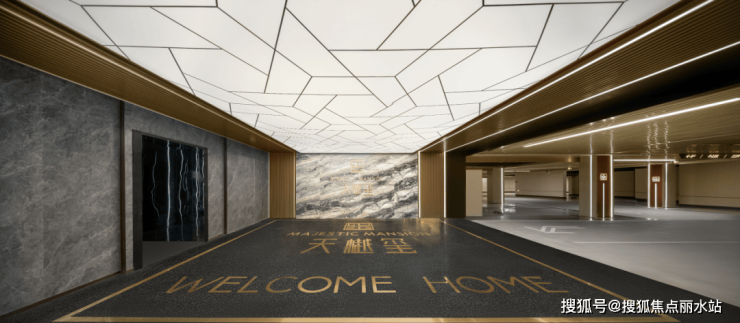 北区人行入口一座宽约60米,高约6米的入户大门,迎面左右各布置3根直径约4.2米的爱马仕灰奢石梭形柱,呈现出最高规格的归家仪式感。大门以奢石为主,以金色立面为主色,即考虑了“土生金”的五行原理,也有“金玉满堂”的寓意。