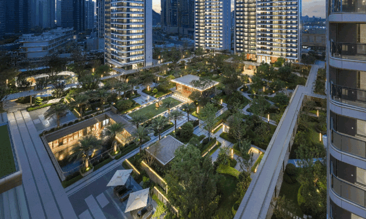 天樾玺采用 “超级中央花园” 围合式布局,花园面积约万方,近百米南北纵深、约80米东西宽度,花园借鉴传奇庄园造园精髓,以修剪精准的圆弧形绿篱勾勒艺术骨架,搭配乌桕主题林木与微地形设计,疏林草坡、阳光丘谷错落其间,漫步其中,如同置身立体画卷,四季皆有不同景致。MAJESTIC