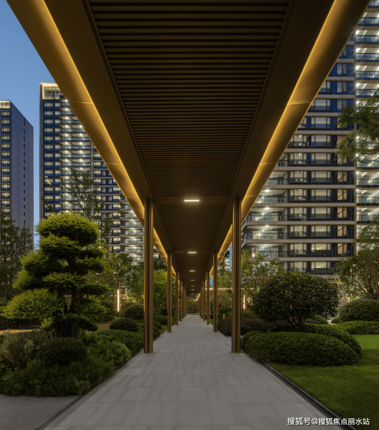 步入社区,约25米宽的门廊形成天然框镜,将第二重山水会客厅、第三重央座庭院串联成中轴序列。每一步前行,都是尺度与心境的从容过渡。