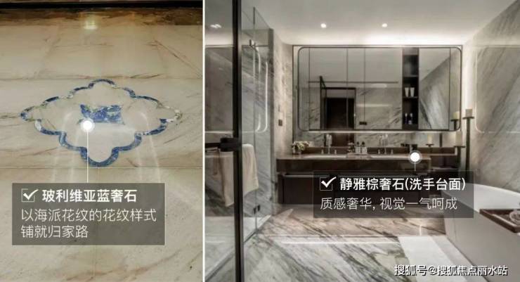 从私家电梯厅开始,地面局部点缀皇家蓝的玻利维亚蓝奢石,号称奢石中的爱马仕,并刻成海派花纹的样式,优雅又具仪式感。