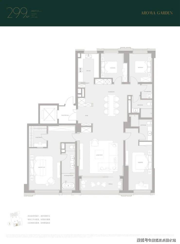 其中建面约299㎡,南向双套房,尤其主卧是豪华套房,带独立衣帽间,卫浴间含双台盆+淋浴+浴缸+马桶四件套。