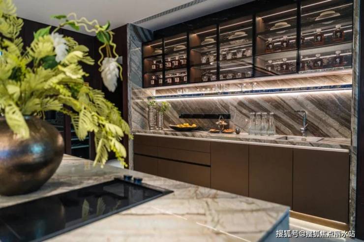 西厨吧台更是匹配了符合空间调性的东方木纹石材,独特纹理和质感提升了厨房品质与艺术性。